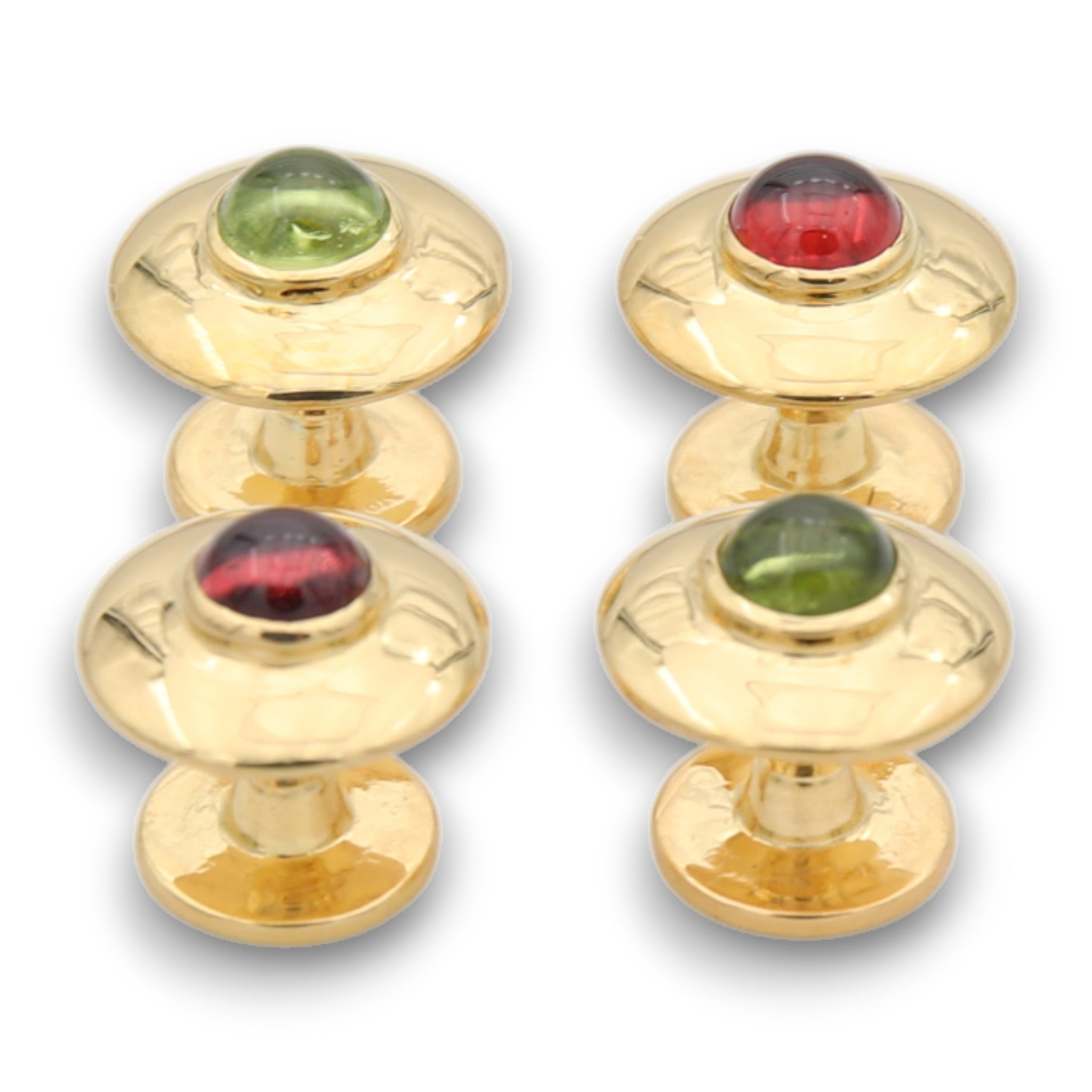 Elegante juego de botones elaborado en plata de primera ley 925 con baño de oro de 18 quilates, compuesto por dos piedras preciosas en colores contrastantes: granate rojo intenso y peridoto brillante.