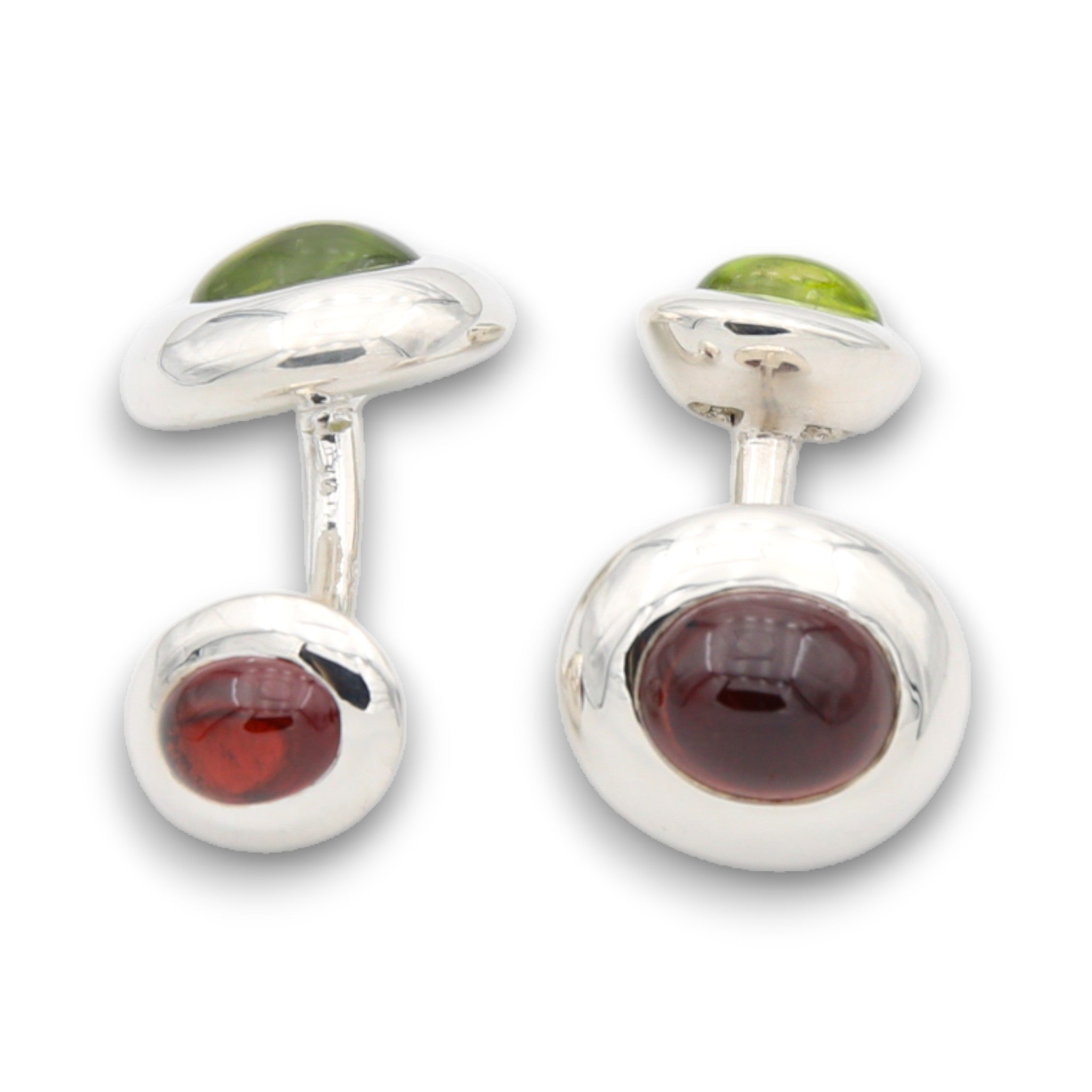 Gemelos elegantes de plata 925 con piedras de cabujón elaboradas. El par impresiona por su armoniosa composición de colores: un botón presenta granate delante y peridoto detrás, mientras que el otro tiene las piedras en orden inverso. Este diseño bien pensado permite una variedad de opciones de combinación según la ocasión y el atuendo. Las piedras preciosas de alta calidad en forma clásica de talla cabujón aportan a cada traje un toque sutil y sofisticado. Perfecto para el caballero exigente que valora la artesanía y la elegancia atemporal.