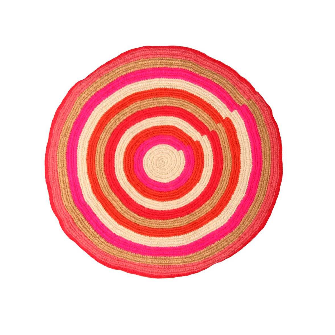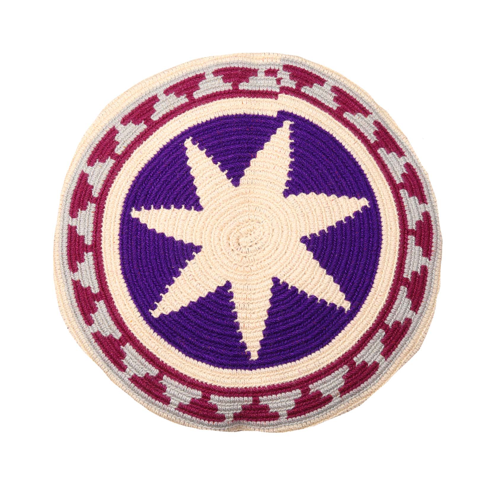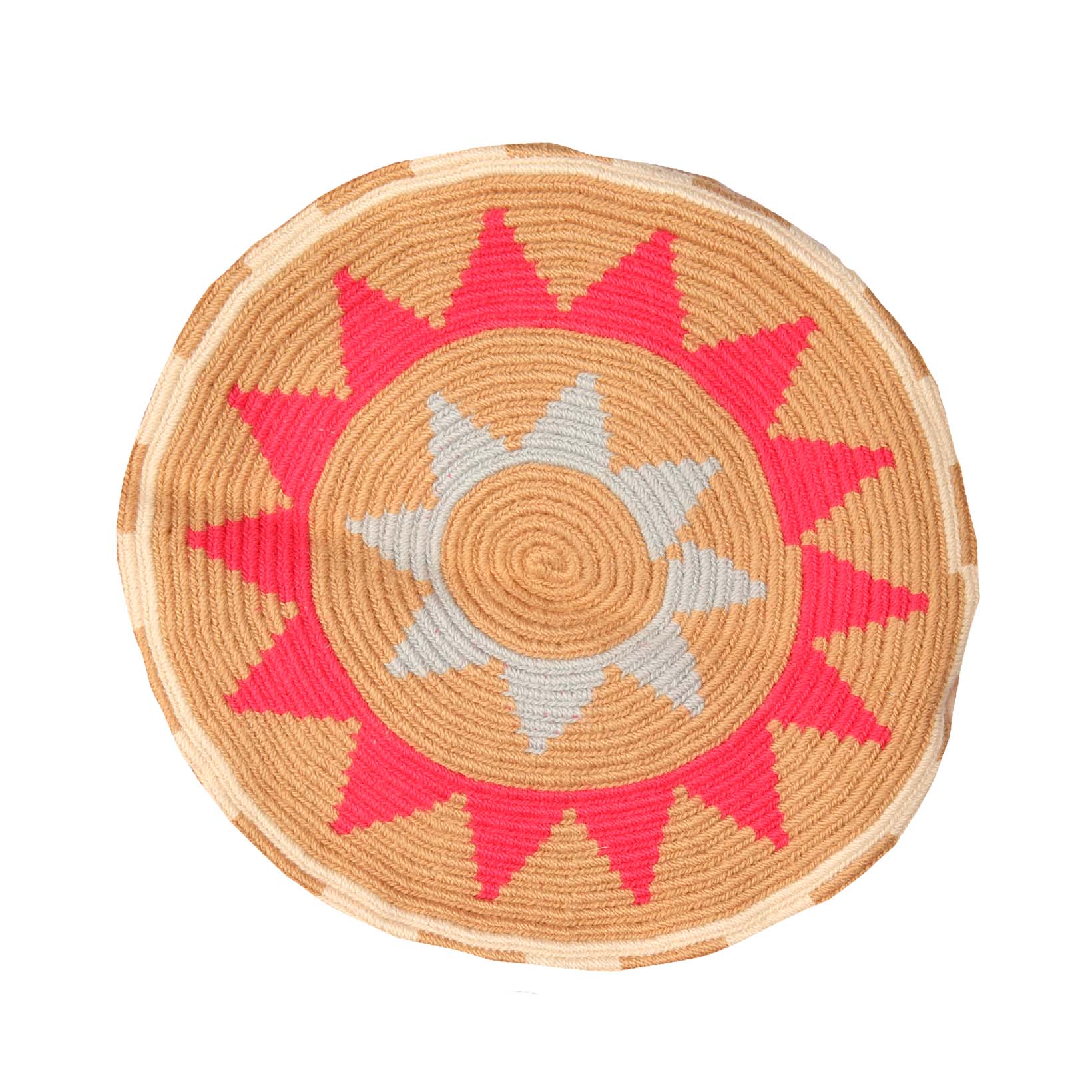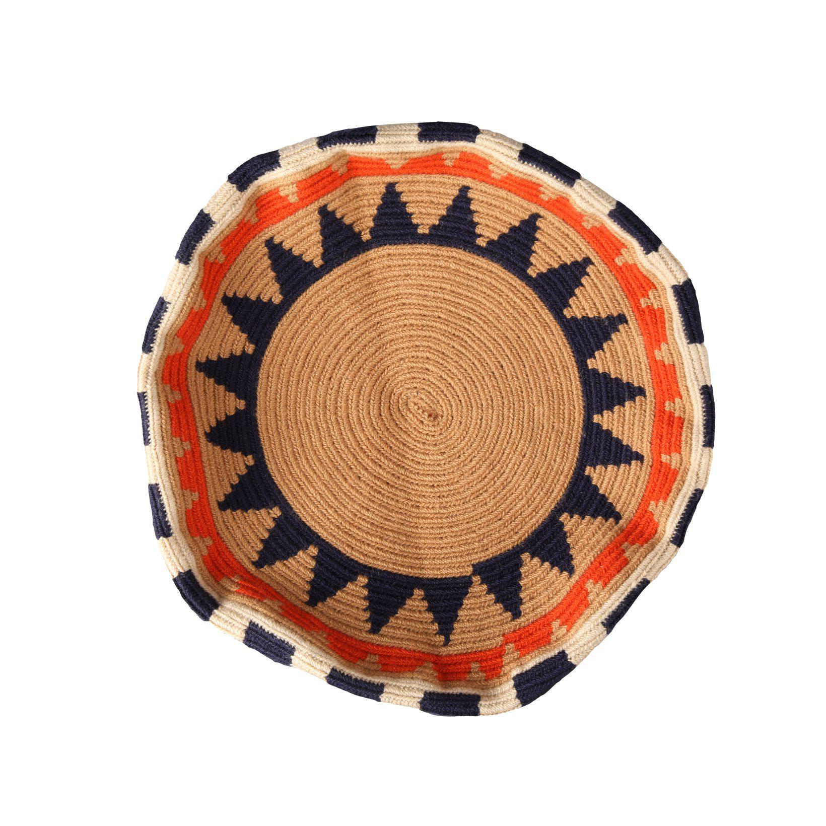 La borsa è all'uncinetta a mano a mano a mano artigiane in Colombia, che ha montato tecniche tradizionali. La forma rotonda e con un top aperto, ha due maniglie corte per indossarli come una borsetta.