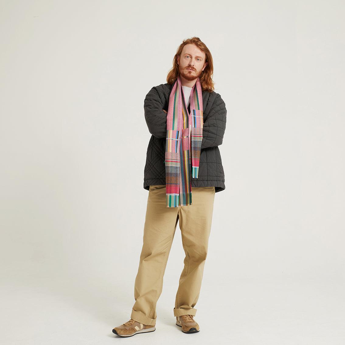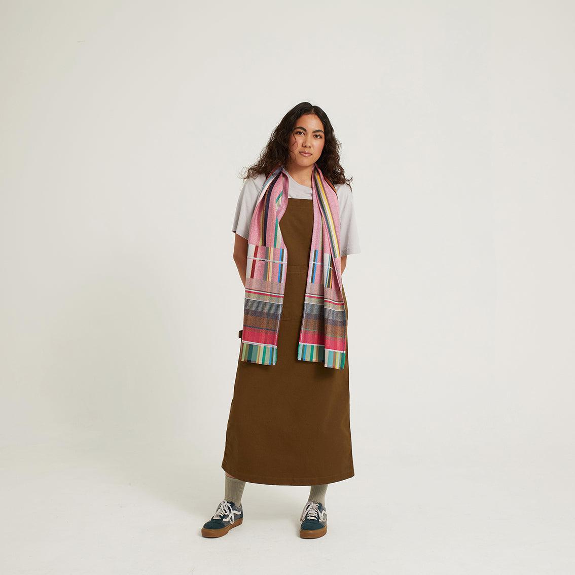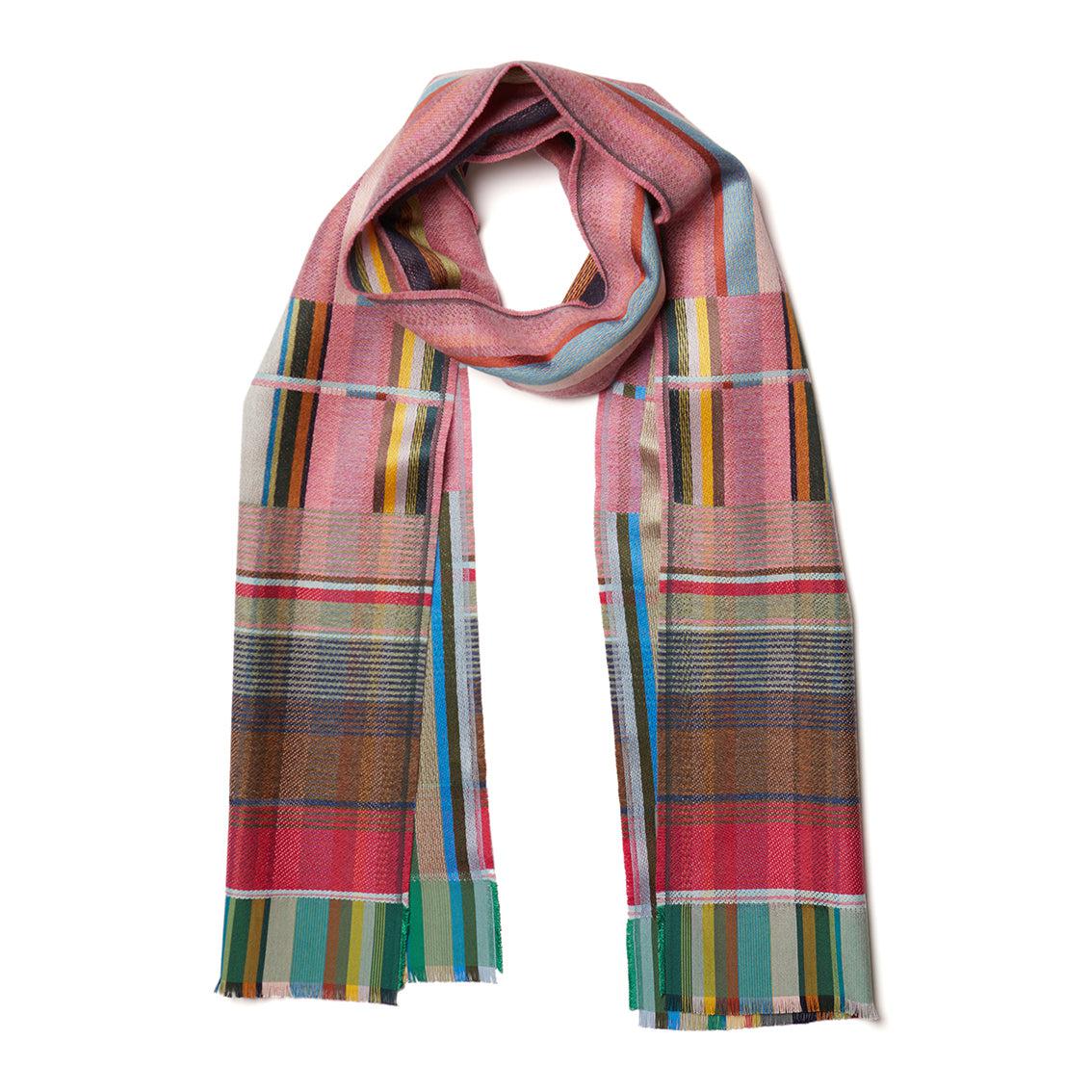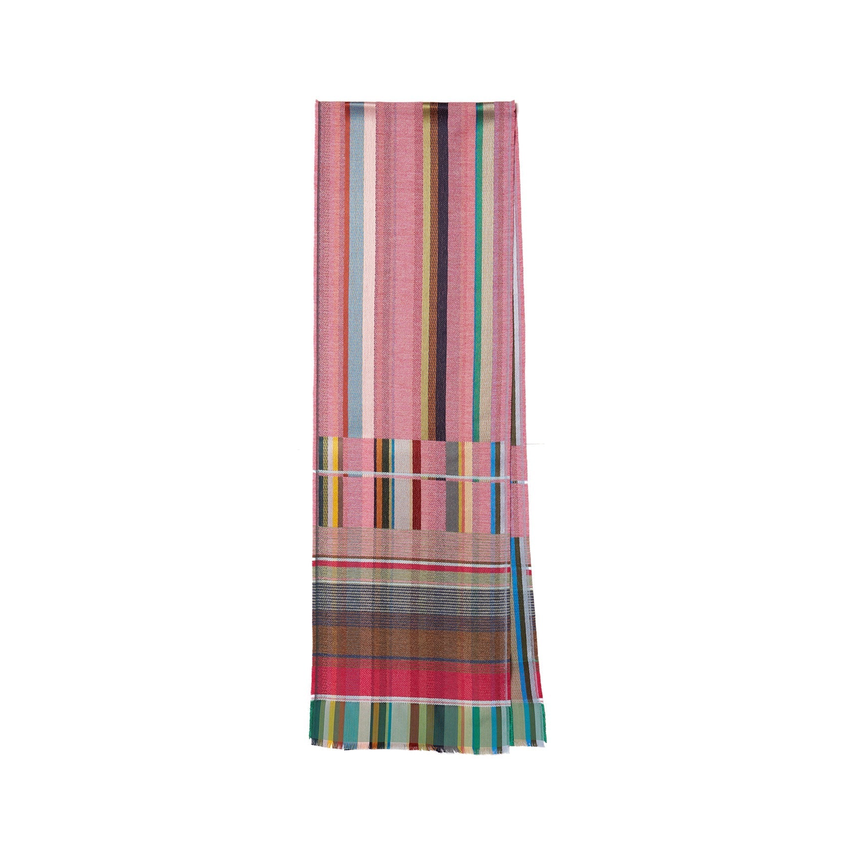 Ein verspieltes Rosa, das durch ein mittleres Braun und beruhigende grüne und blaue Streifen in den Bordüren erwärmt wird, die durch zarte Lavendelfarbtöne hervorgehoben werden.